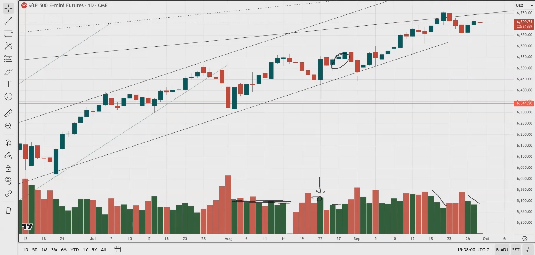 The S&P has been showing some interesting characteristics in recent weeks that warrant closer attention. We’re observing a notable shift in market dynamics, with supply increasing while demand has been decreasing. This combination is creating a setup that could lead to increased market volatility in the near term.