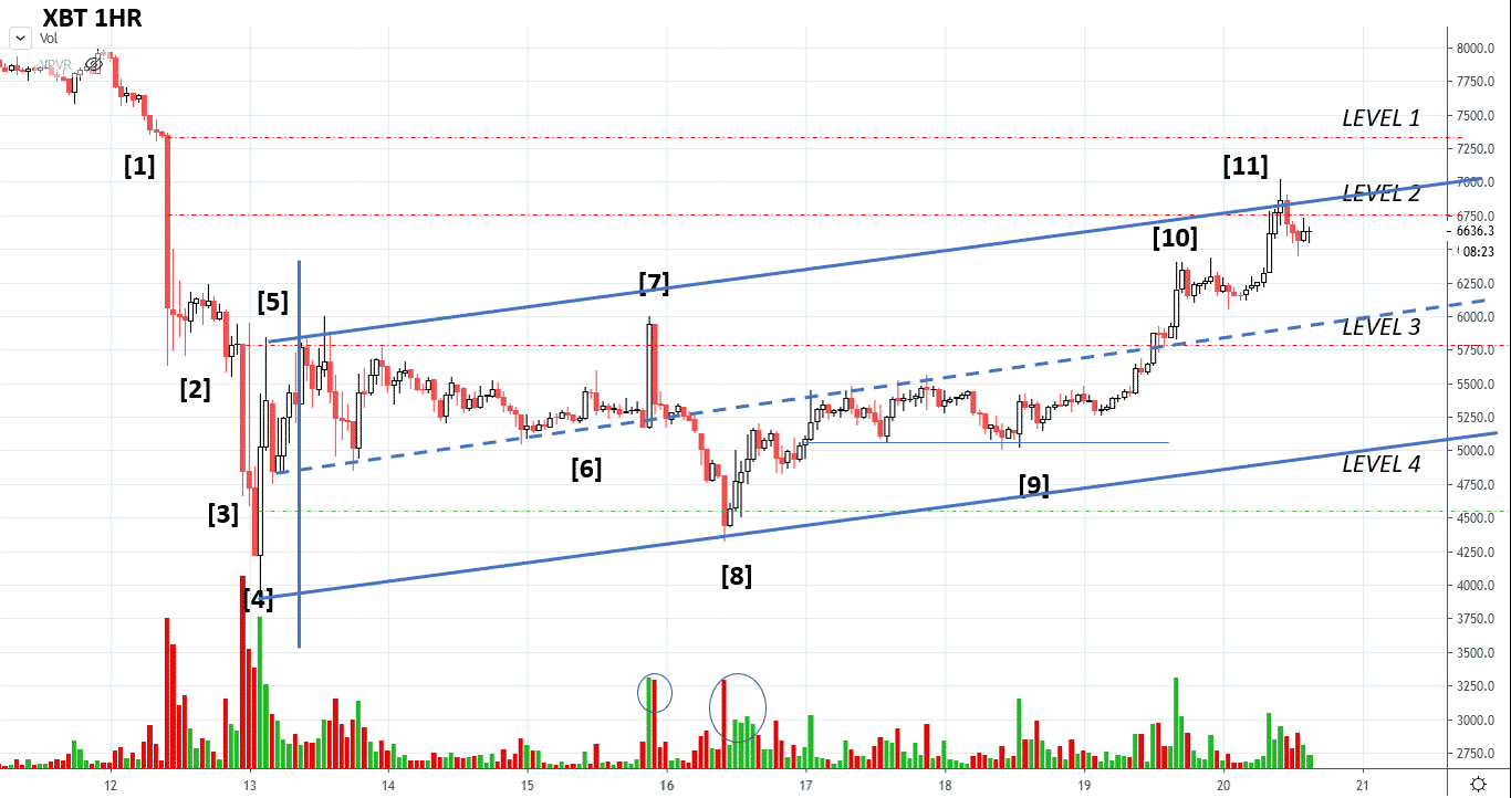 The big bar at point [1] represents the beginning of the capitulation move. Margin calls trigger the drop, Bitcoin is a source of funding. Level #1 is the top of the capitulation bar. The halfpoint of this big capitulation bar defines Level #2. Supply is dominant on this two levels, and short term traders should look for upthrusts in this supply zone, confirmed by a swing reversal.